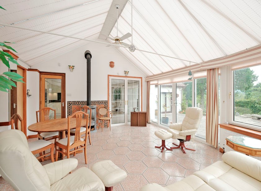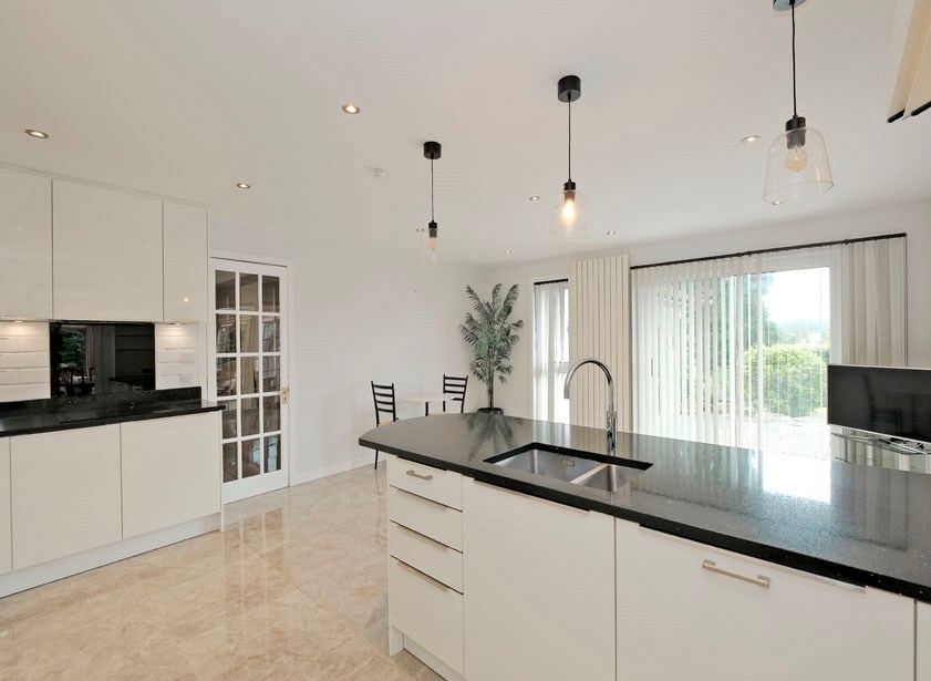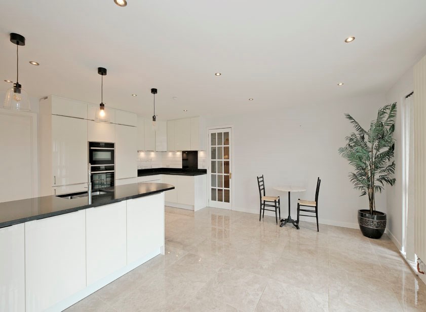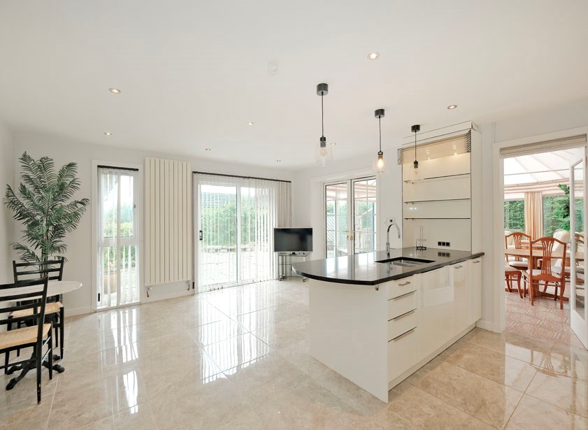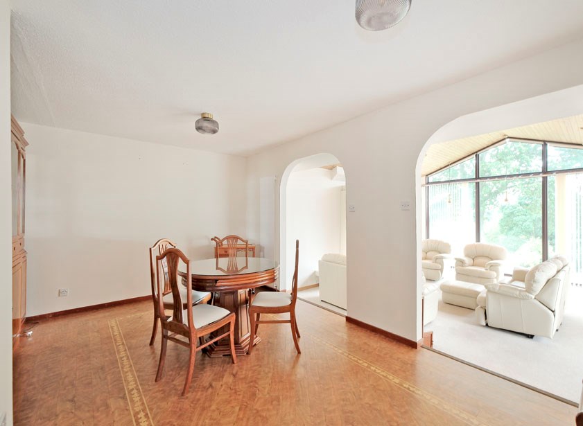 The internal accommodation comprises: welcoming reception hall with large walk in cupboard for excellent storage; stunning contemporary dining kitchen. Featuring ceramic tiled flooring, extensive white gloss base, wall & display cabinetry for excellent storage, a range of appliance, and direct access to the south facing garden terrace as well as the large utility space with further storage and appliances in situ; off the dining kitchen there is a lovely large conservatory space, perfect for dining or entertaining; split level space with formal dining space and lounge on semi open plan, with large windows allowing for lights of light, and direct access to the rear garden; 5 great sized double bedrooms all with built in storage. 2 of the double bedrooms have en suites with white suites, one with jacuzzi bath and shower enclosure, and the second with large shower enclosure.