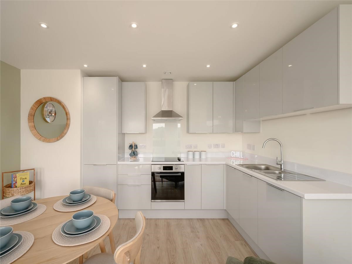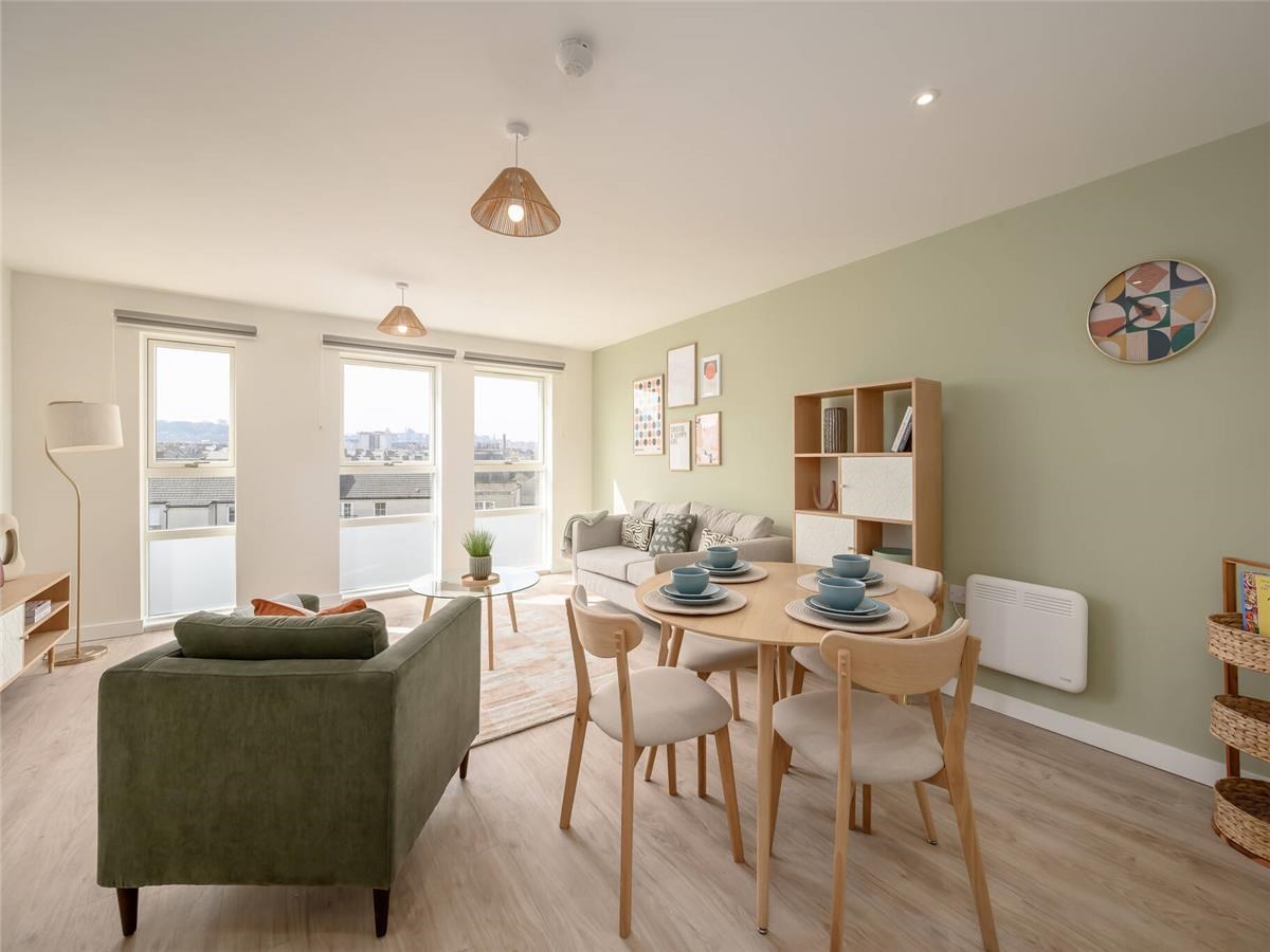 The apartments are tastefully decorated and comprise of open plan fitted kitchens with integrated appliances, fully tiled bathrooms and spacious bed-rooms with fitted wardrobes offering ample storage space. The design for the living spaces offers an inviting, contemporary feel, anchored by boucle sofas featuring forest green & grey tones with coordinated armchairs. The space is enhanced with oak and glass occasional furniture perfectly complementing the overall design and creating a truly desirable living space.