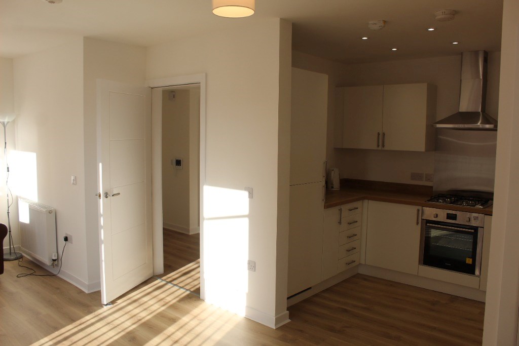 The spacious second floor property is light and bright and has been built to a high specification. Accommodation comprises: lounge/dining room to open plan kitchen with gas hob, electric oven, washer/dryer, fridge/freezer and dishwasher. Two double bedrooms (with fitted wardrobes) and bathroom with mains shower. Additional benefits include gas central heating, double glazing, security entry, parking (on first come first served basis) and access to common wi-fi.