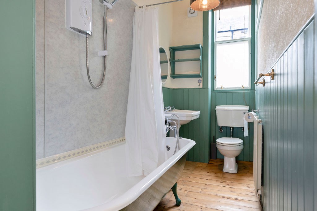 ~Stylish and elegant bathroom suite with electric shower over bathtub