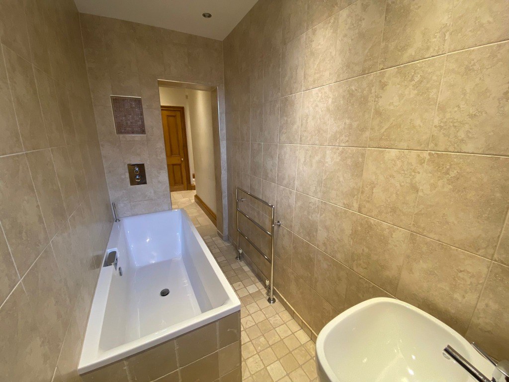 The accommodation comprises: a large welcoming hallway, spacious lounge with an attractive (non-functional) feature fireplace, modern separate kitchen, two generous double bedrooms – the master benefiting from an en-suite shower room – and a family bathroom with bath and handheld shower.
