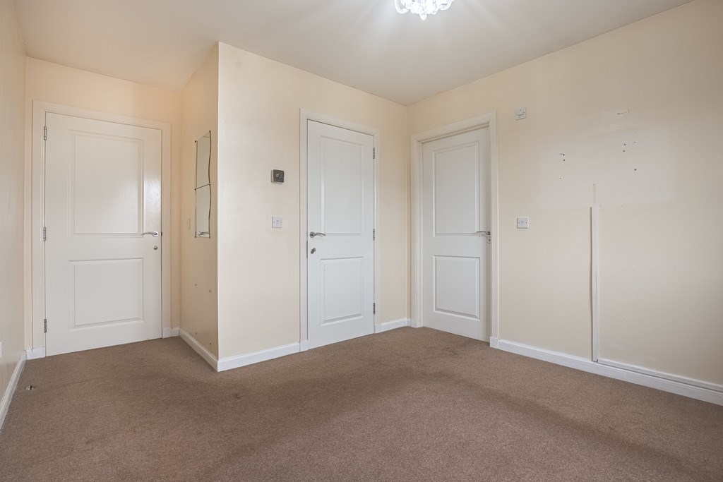 BEDROOM 3 A further generously sized bedroom is located at the rear of the property, featuring a neutral color scheme and beige carpeted flooring. The spacious layout provides plenty of room to accommodate additional furniture.