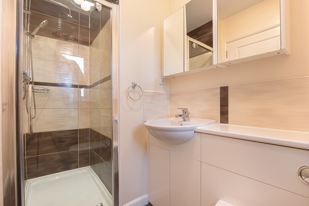 BEDROOM 2 Bedroom two is a generously sized room located at the rear of the property, offering a pleasant view of the back garden. It is decorated with beige carpeted flooring and cream walls, creating a calm and inviting atmosphere. Sliding integrated mirrored wardrobes provide ample storage space. This room also benefits from an en-suite, featuring a fitted vanity unit and a separate shower cubicle with tasteful tiled surrounds.