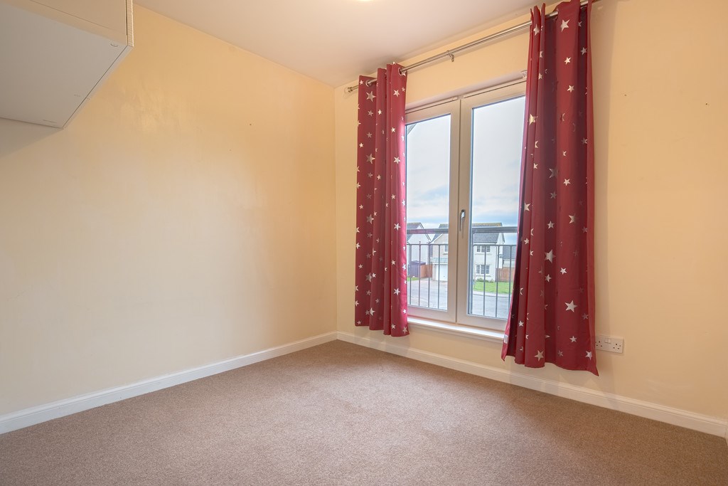 BEDROOM 4 Bedroom four offers a spacious setting located at the front of the property, featuring cream walls and beige carpeted flooring. The room is filled with natural light, thanks to large floor-to-ceiling windows. An alcove within the room includes wall-mounted storage, and there is plenty of space for additional freestanding furniture.