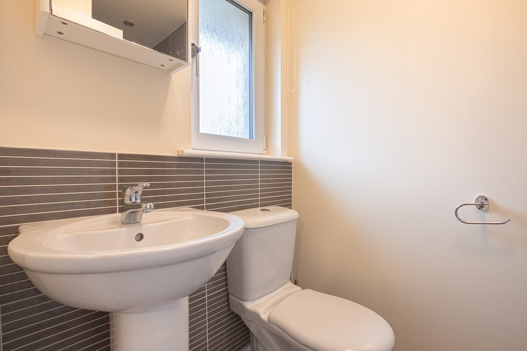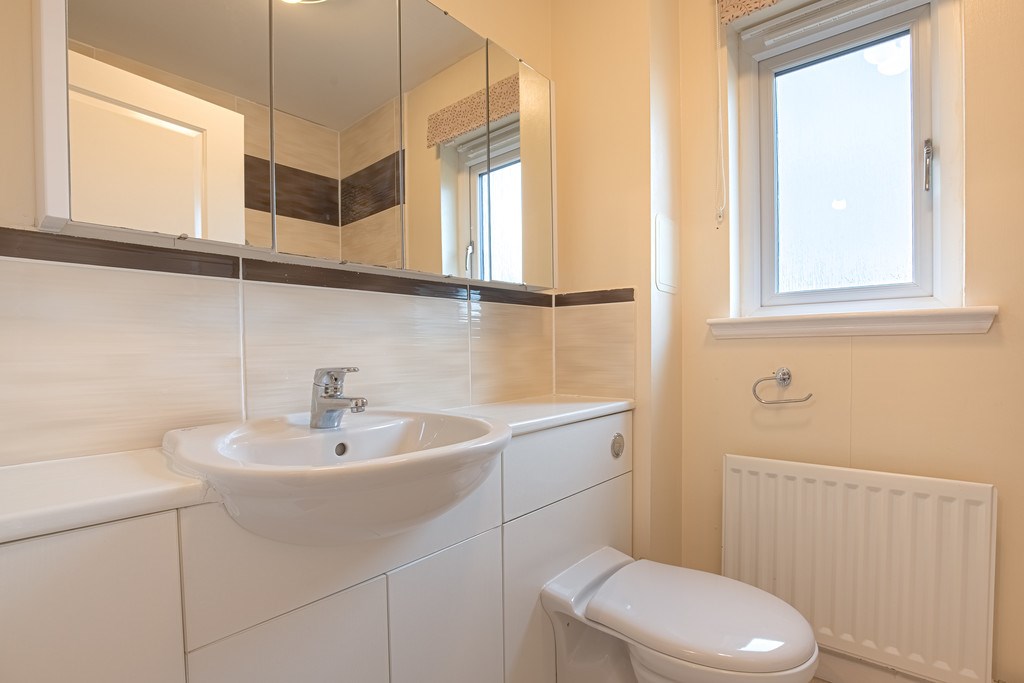 FAMILY BATHROOM This generously sized family bathroom features a fully integrated vanity unit, including a sink and toilet. A row of mirrored storage cabinets offers excellent storage options. The bathroom also benefits from a shower over the bath, along with a privacy window for added comfort and light.