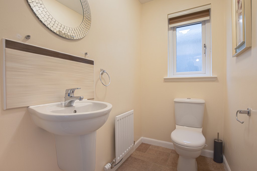 WC This charming WC features beige block flooring, a freestanding toilet, and a wall-mounted sink. A large round mirror adds a touch of elegance, while a privacy window ensures natural light and seclusion. Additionally, there is a convenient storage cupboard for added practicality.