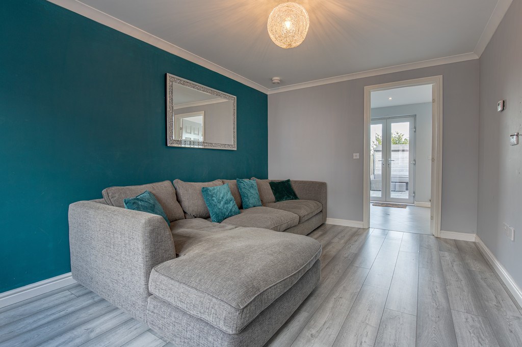 The room benefits from contemporary wood-effect flooring and offers ample space for both relaxing and entertaining. Double doors lead seamlessly through to the dining kitchen, enhancing the flow of the home and providing an open, sociable layout ideal for families or professionals alike.