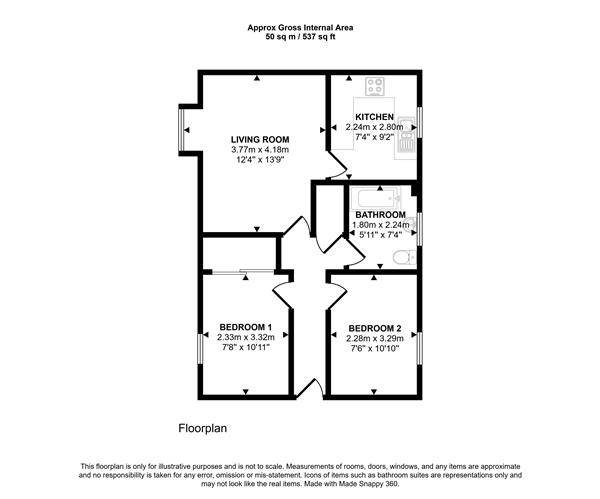 Entered through a well maintained stairwell, the accomodation comprises: entrance hall with cupboard off; living room; kitchen; double bedroom 1 with built-in wardrobe; double bedroom 2 and bathroom with shower over bath.
