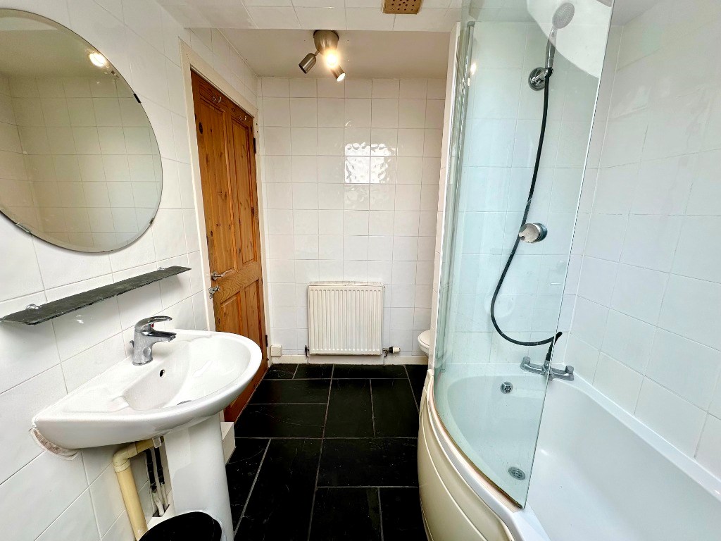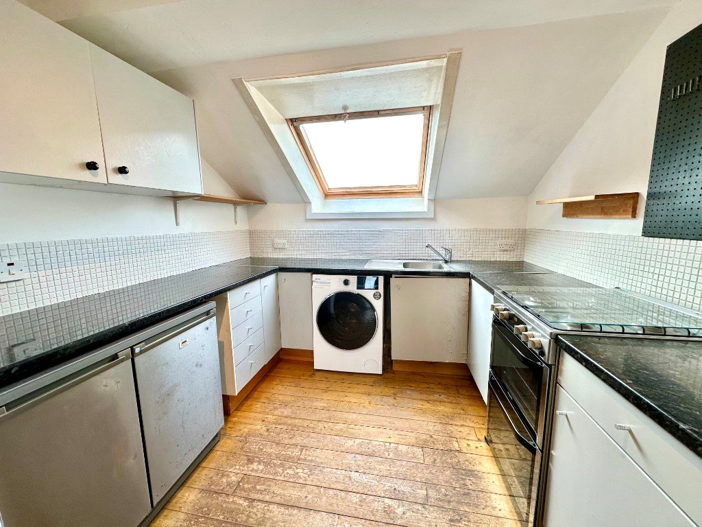 Internally the flat comprises of hallway with storage cupboard off, spacious, open-plan lounge and kitchen benefit from dual-aspect windows, creating a light-filled living space. The fitted kitchen comes complete with gas cooker, under counter fridge, under counter freezer and washing machine. There are two bedrooms, one double and one single, both with storage and a bathroom with three piece white bathroom suite and shower over the bath.