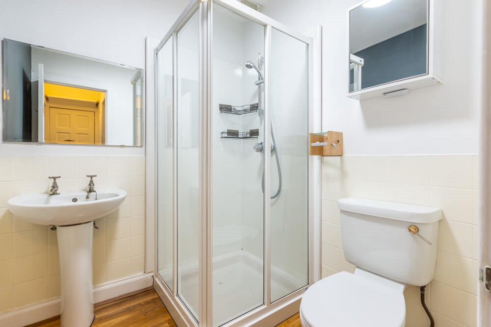 ~Tiled bathroom with shower, toilet and basin