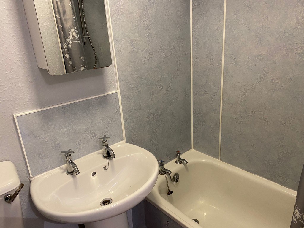 BATHROOM Traditional three piece white suite with shower over bath.