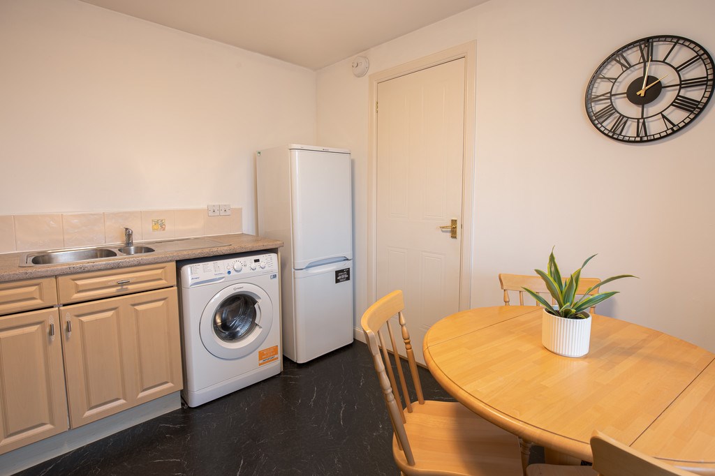KITCHEN/DINER Extensive modern kitchen with a range of appliances includes a electric hob and oven. Includes a dining area for four. Plenty of storage is provided by the light wood base and wall units and the counter tops are a lovely stone effect colour.
