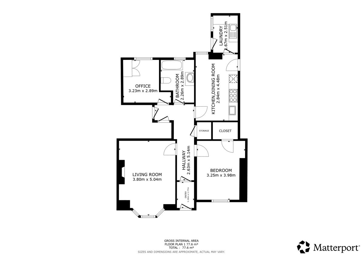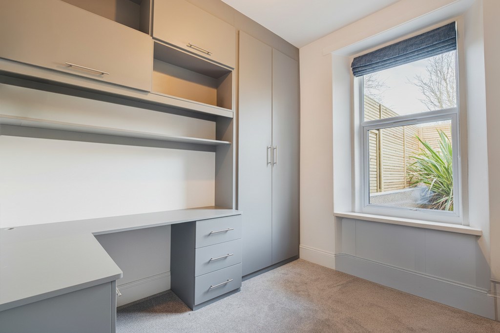 BEDROOM/STUDY This room is located down the hallway and on the left-hand side as you enter through the front. This room feels wonderfully practical and thoughtfully designed, with a clean, modern look that makes it both functional and inviting. The built-in cabinetry offers an impressive amount of storage, keeping everything organized while maintaining a streamlined and sleek appearance. The window brings in lovely natural light and offers a pleasant view of greenery outside, giving the space a fresh feel.