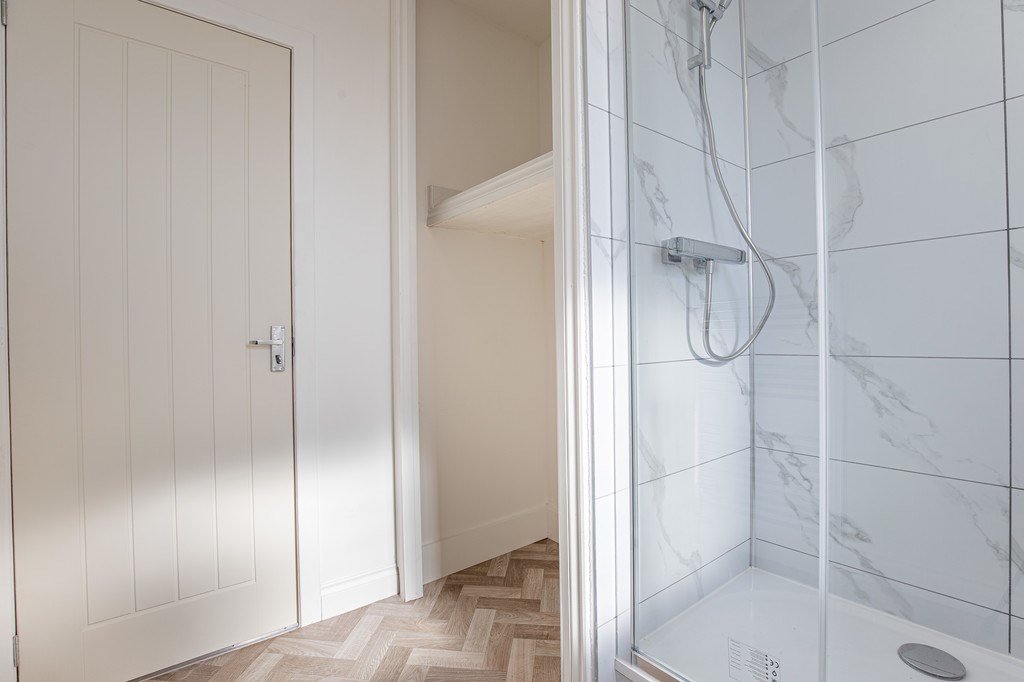 SHOWER ROOM Contemporary shower room with a three piece suite including a walk-in shower cubicle, wash hand basin with under sink storage and toilet. Tiled splashback areas with marble effect tiles and vinyl flooring completes this room.