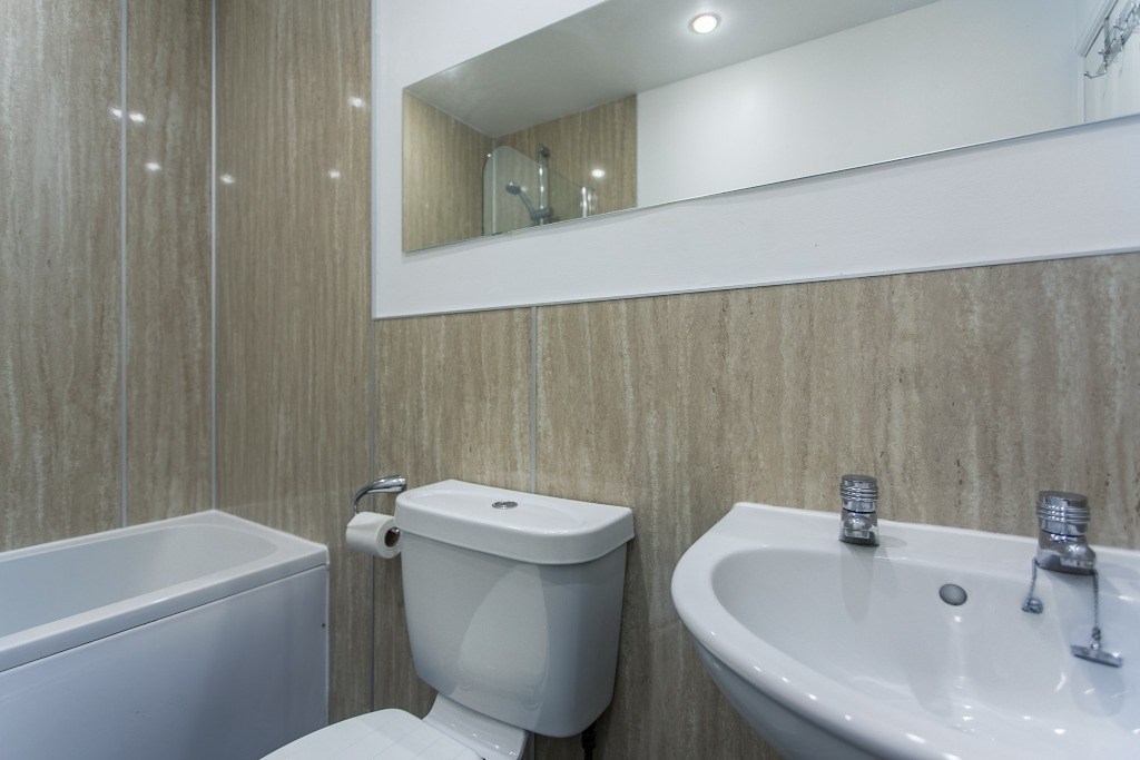 BATHROOM: white suite with shower over the bath, shower screen, wall mirror