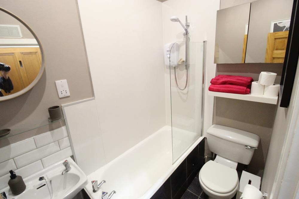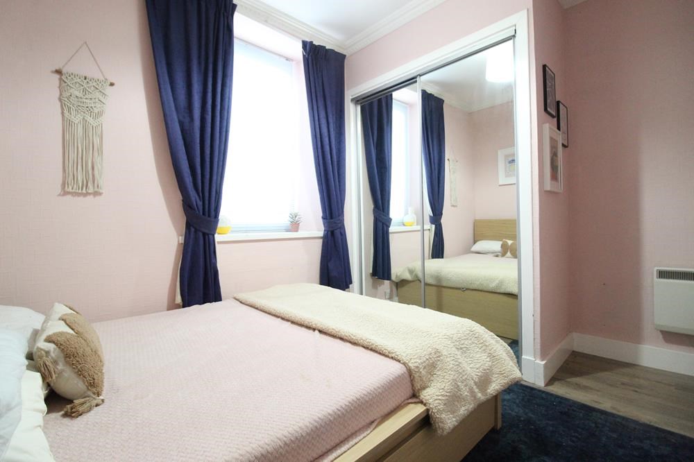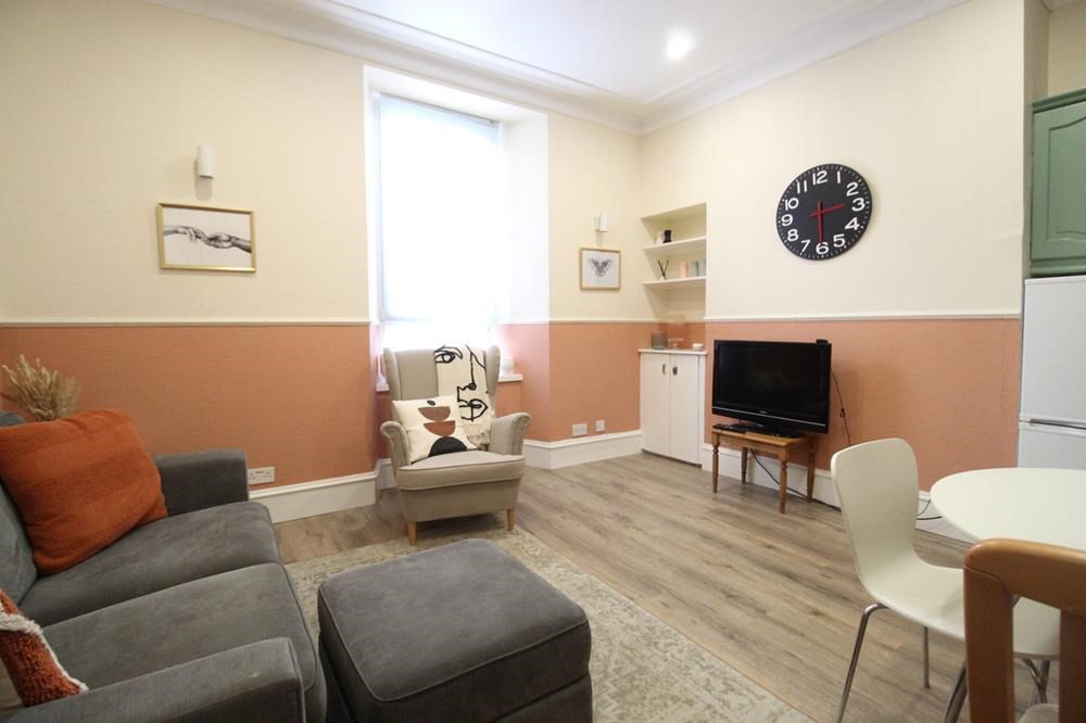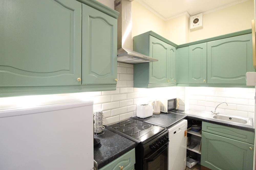 Situated on the ground floor, the property is tastefully decorated in soft pastel tones and benefits from high ceilings and generous natural light throughout. The accommodation comprises a bright and welcoming lounge with ample storage, a stylish open-plan galley kitchen, a comfortable double bedroom overlooking the rear of the property, and a modern bathroom with an electric shower over bath.