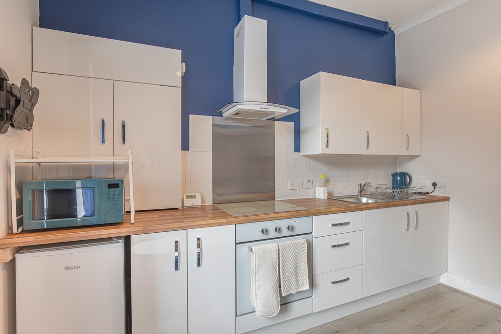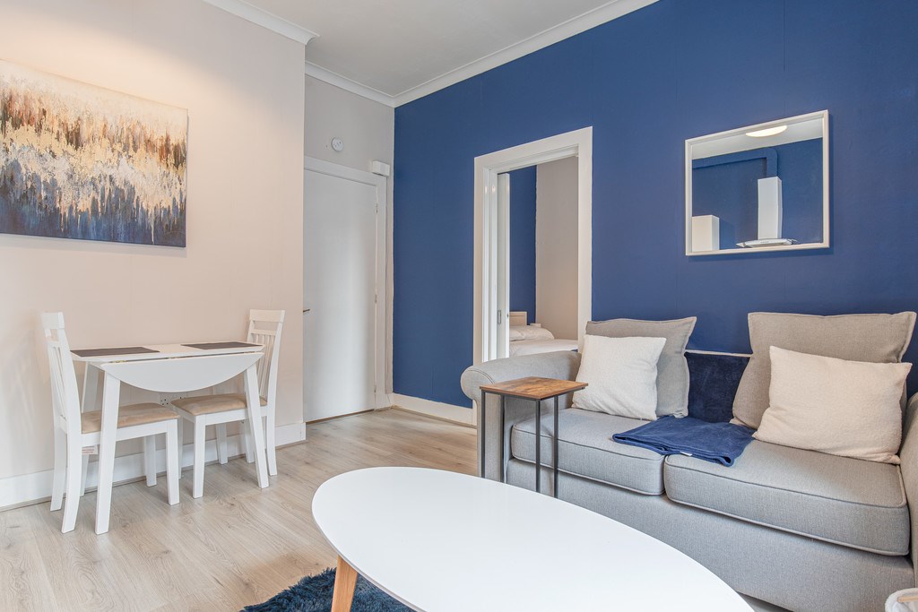 OPEN PLAN KITCHEN/LIVING The open-plan living room and kitchen area is welcoming and functional, with a modern fitted kitchen featuring white gloss cabinets, wooden countertops, integrated oven, and electric hob. The lounge area offers a cosy sofa, coffee table, and dining table for two, all set against tasteful blue and neutral décor.