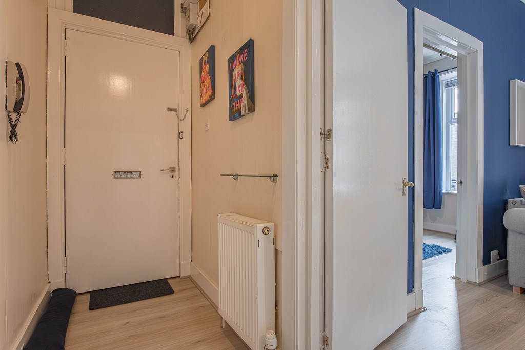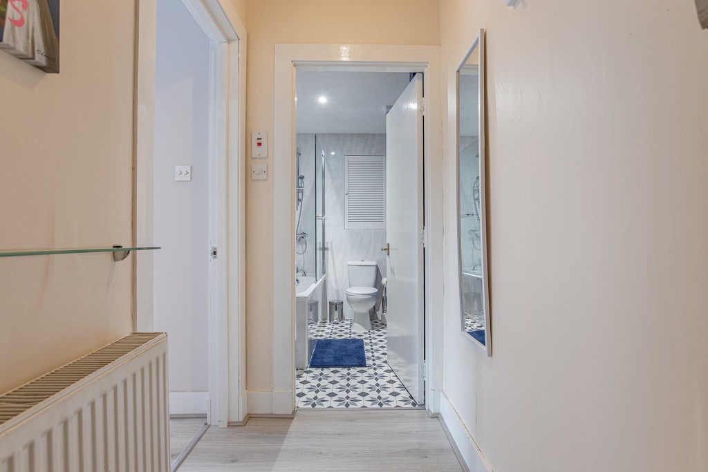 HALLWAY The hallway is well-lit and practical, with wood-effect flooring and access to all rooms. It also includes a radiator, wall-mounted mirror, and storage shelf.