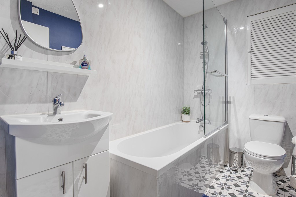 BATHROOM The bathroom is bright and contemporary, with a full-sized bath and overhead shower, a modern vanity unit with under-sink storage, and a toilet. The stylish tiled walls and patterned floor give the space a fresh and elegant finish.