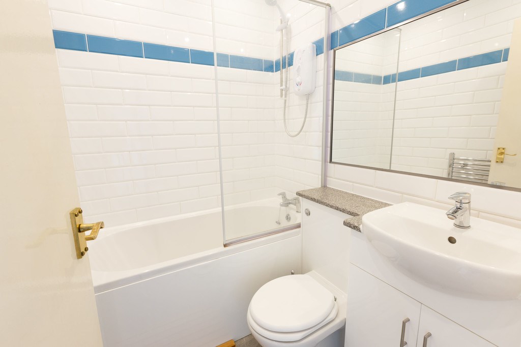 BATHROOM Modern three piece white suite with shower over bath and white and blue subway tiles.