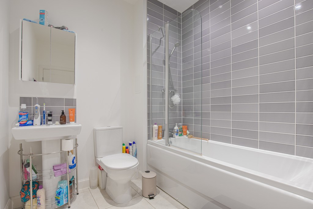 BATHROOM The family bathroom is modern and stylish, finished with sleek grey tiling around the bath and shower area that adds a contemporary touch. It features a white three-piece suite, including a bath with overhead shower and glass screen, a WC, and a compact wash basin with mirrored cabinet above for storage. The neutral décor is complemented by light floor tiles, creating a bright and clean feel throughout. Practical touches such as shelving and chrome fixtures make this bathroom both functional and attractive, ideal for everyday family use.