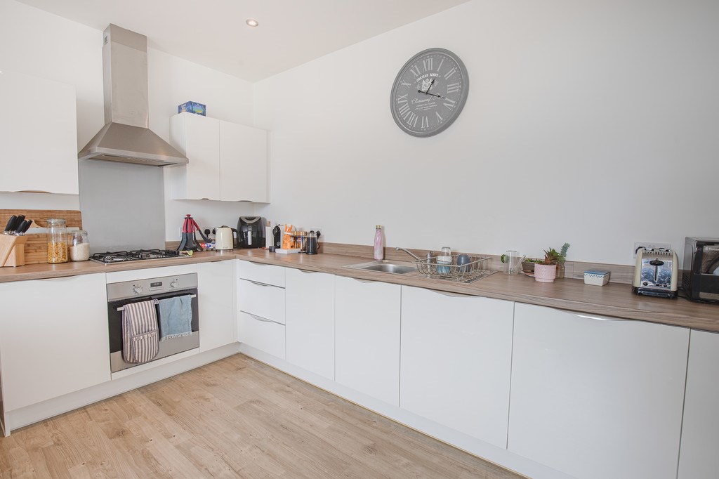 OPEN PLAN LIVING/KITCHEN This open-plan living, kitchen and dining area is bright, spacious and modern, offering the perfect layout for contemporary living. The lounge features a large sectional sofa and additional seating, arranged around a coffee table and TV unit, with a tall feature window flooding the room with natural light. Neutral décor, recessed lighting and a mix of carpet and wood-style flooring add a stylish yet homely touch. The kitchen is sleek and well-designed, with glossy white cabinets, wood-effect worktops and integrated appliances including an oven with gas hob and extractor. A generous run of units provides ample storage and workspace, making it both practical and attractive. The open layout allows for easy flow between cooking, dining and relaxing, creating a welcoming social space that is ideal for both everyday use and entertaining.