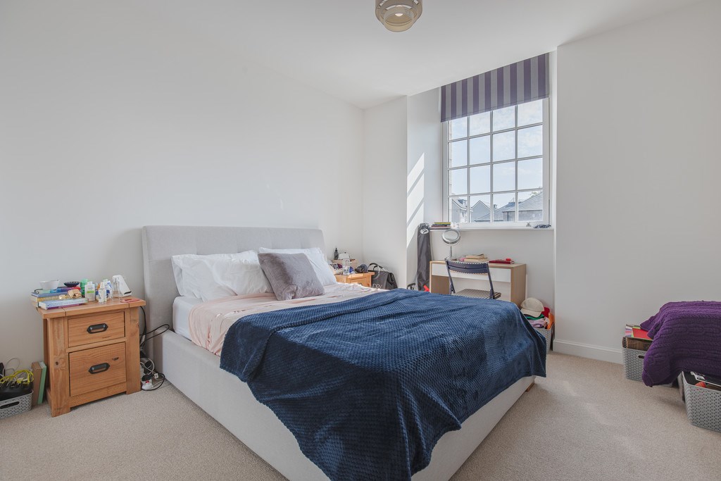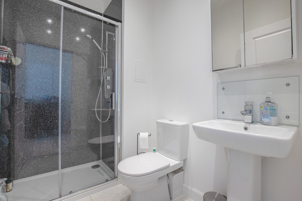 MASTER BEDROOM The master bedroom is bright and generously sized, designed to offer both comfort and functionality. A large feature window allows plenty of natural light to flood in, creating a fresh and airy feel. The room is finished in neutral tones with soft carpeting underfoot, providing a calm and relaxing atmosphere. Furnishings include a modern upholstered bed with bedside tables, while mirrored fitted wardrobes provide excellent storage and help enhance the sense of space. The room also benefits from a contemporary en-suite shower room, fitted with a walk-in glass shower, WC, and wash basin with mirrored storage above.