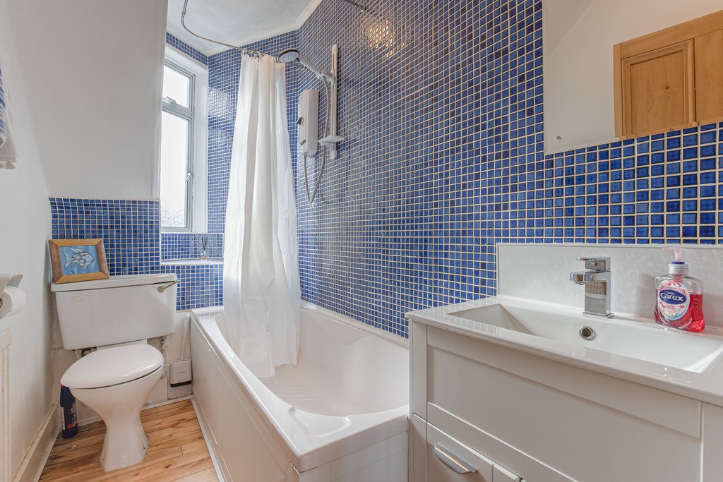 BATHROOM The bathroom is beautifully finished with an eye-catching blue mosaic tile design that adds character and style to the space. It is fitted with a bath, overhead shower, and heated towel rail, combining practicality with comfort. Natural light flows through the window, enhancing the fresh and airy feel of the room.