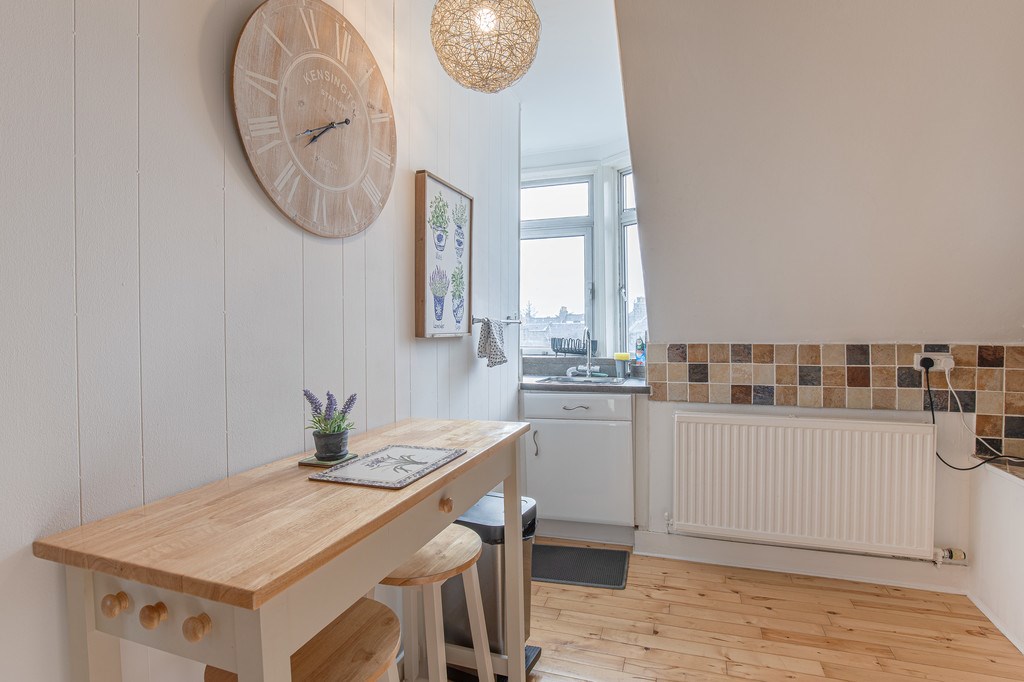Generous cupboard and drawer space, combined with durable wooden flooring, enhances both function and style. A welcoming wooden high table with chairs creates the perfect spot to enjoy meals, whether it's a quick breakfast or a relaxed dinner at the end of the day.