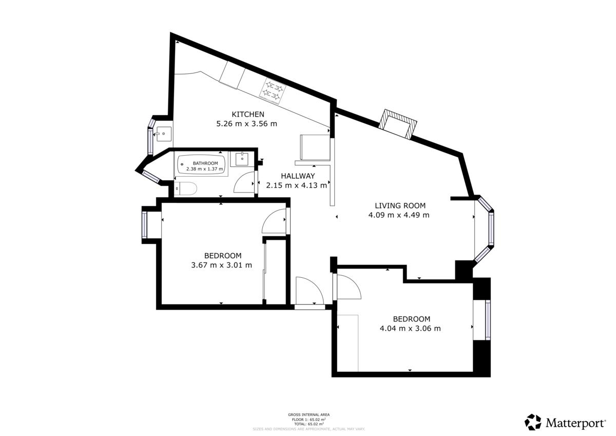 The crisp white walls create a contemporary backdrop, perfectly balanced by the rustic charm of the exposed stone feature wall and its cosy fireplace-adding character and warmth to the room. Rich wooden flooring complements the space, while a comfortable navy double sofa positioned along the side wall provides the ideal spot to relax, unwind, and enjoy a favourite film or series on the TV.