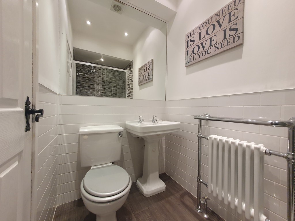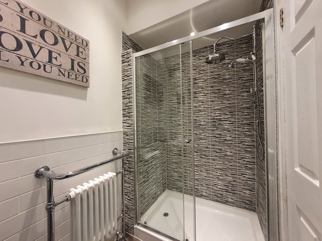 BATHROOM Beautiful three-piece white suite with a large walk-in shower cubicle with a gorgeous Victorian style shower. This room has tiled surround and a large mirror.