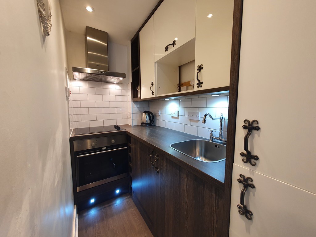 KITCHEN Newly fitted modern kitchen with a range of appliances such as a electric hob and oven, fridge/freezer, kettle and extractor fan. Plenty of storage is provided by the light brown colour base and wall units and the counter tops are a lovely wooden work top.