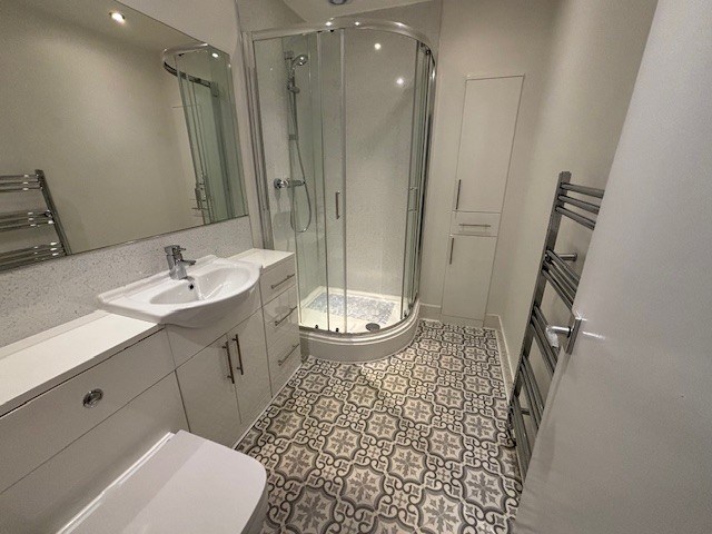 SHOWER ROOM Three-piece shower room with mains-powered shower and ample storage.