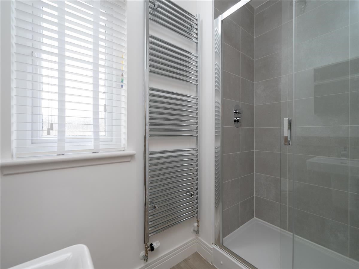 The partially tiled family bathroom is beautifully fitted with a 4-piece suite, in white, comprising; WC, wash-hand basin, bath with hand held mixer shower and large shower cabinet with wall-mounted chrome mixer shower. Large chrome heated towel rail.
