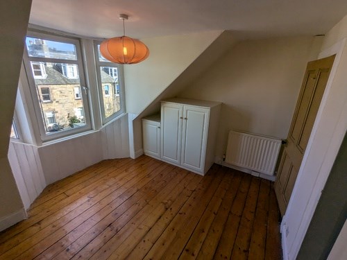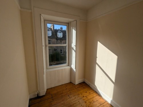This unfurnished property enjoys a very central location whilst remaining fully private & quiet with the benefit of an easily maintained front garden. On the first floor the property has a bright lounge looking out over the street, there is a separate dining room and an open plan kitchen with oven and hob, ample floor and eye level units to include a dishwasher, a washing machine and a free standing fridge freezer. There is a single bedroom / study on this level. The stairs take you to the second floor where both double bedrooms are located and the bathroom with white suite and shower. The flat offers a range of very useful storage cupboards, a private front garden and close proximity to Edinburgh town centre.