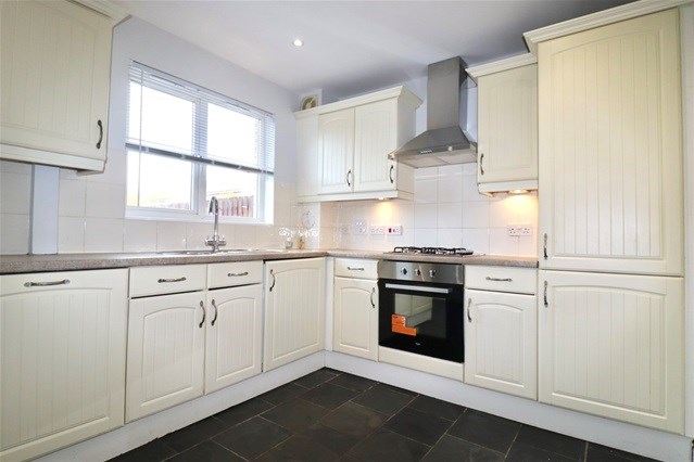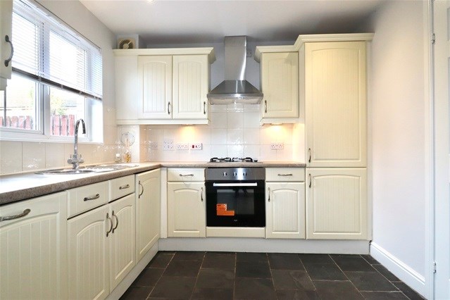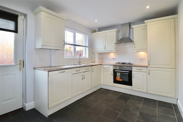 The ground floor comprises a welcoming entrance hall, a bright and spacious living room, and a modern kitchen complete with integrated appliances: washing machine, fridge/freezer, dishwasher, gas hob, and oven. From here, there is direct access to the fully enclosed rear garden, ideal for families or entertaining.