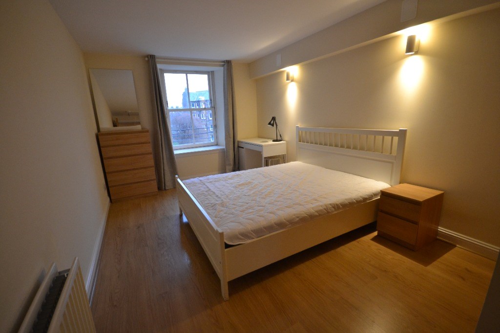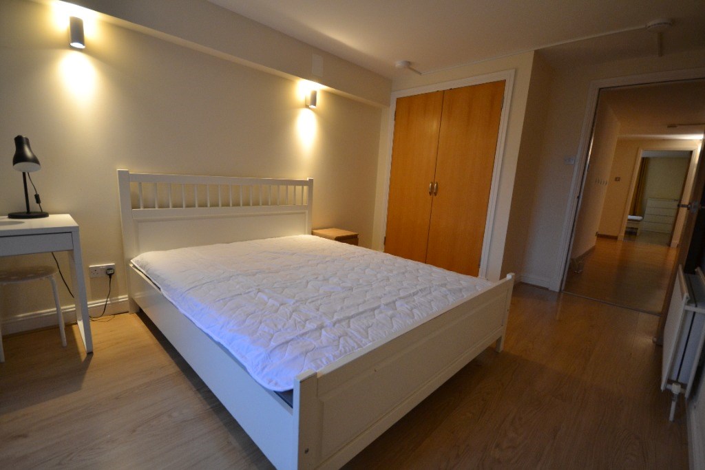 There are two further good-sized double bedrooms, one furnished with a bed and wardrobe, and the other featuring a built-in wardrobe, both with large windows.