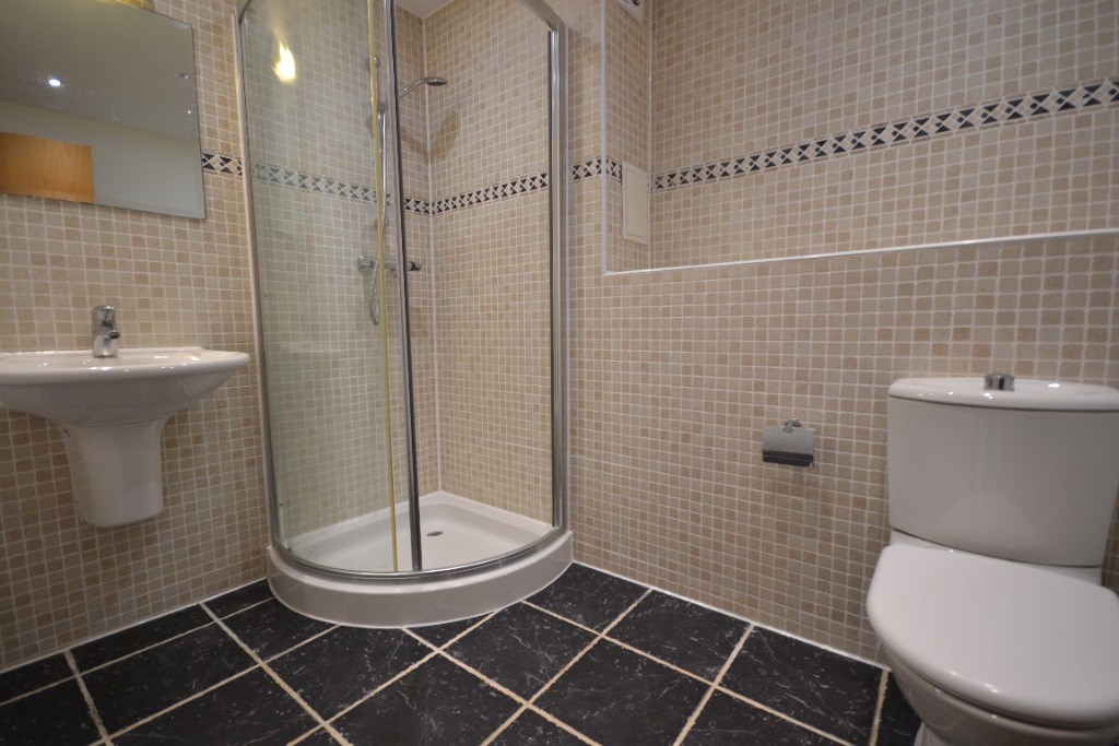 The main bathroom is fully tiled and in good condition, fitted with a bath and shower over.