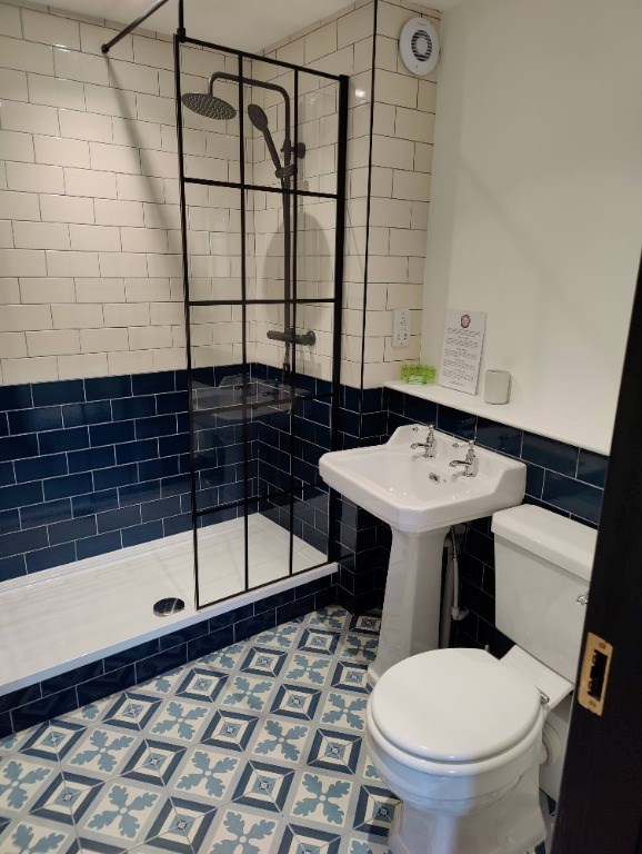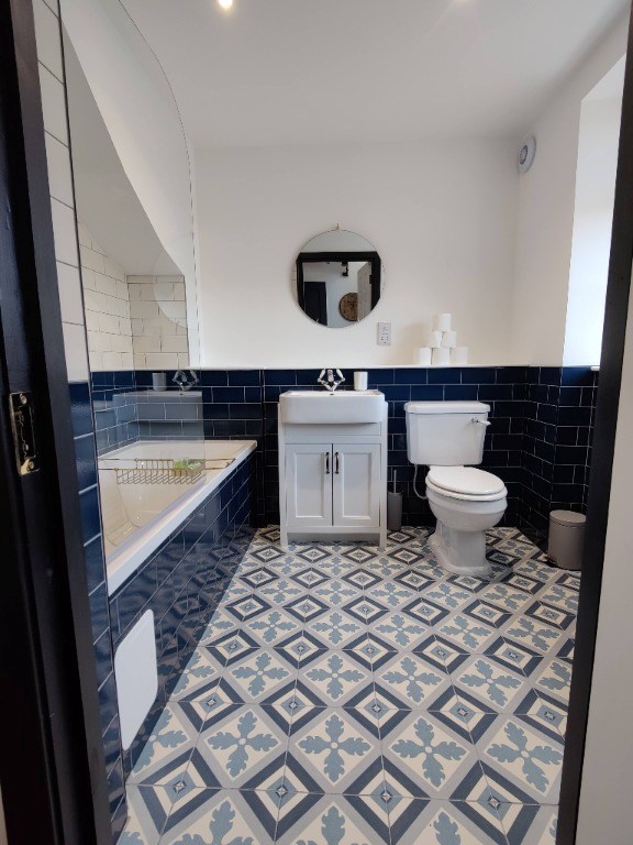 As you descend from the grand bedroom, you enter the kitchen living room level. The kitchen is modern and well-equipped with all the necessary appliances to prepare meals for family and friends. The living room is tastefully furnished and provides a comfortable space to relax and unwind. The bathroom, with its deep bath and tiled walls, adds to the elegance of the space. The stairs then lead down to the other bedroom with its ensuite, offering privacy and comfort to guests.