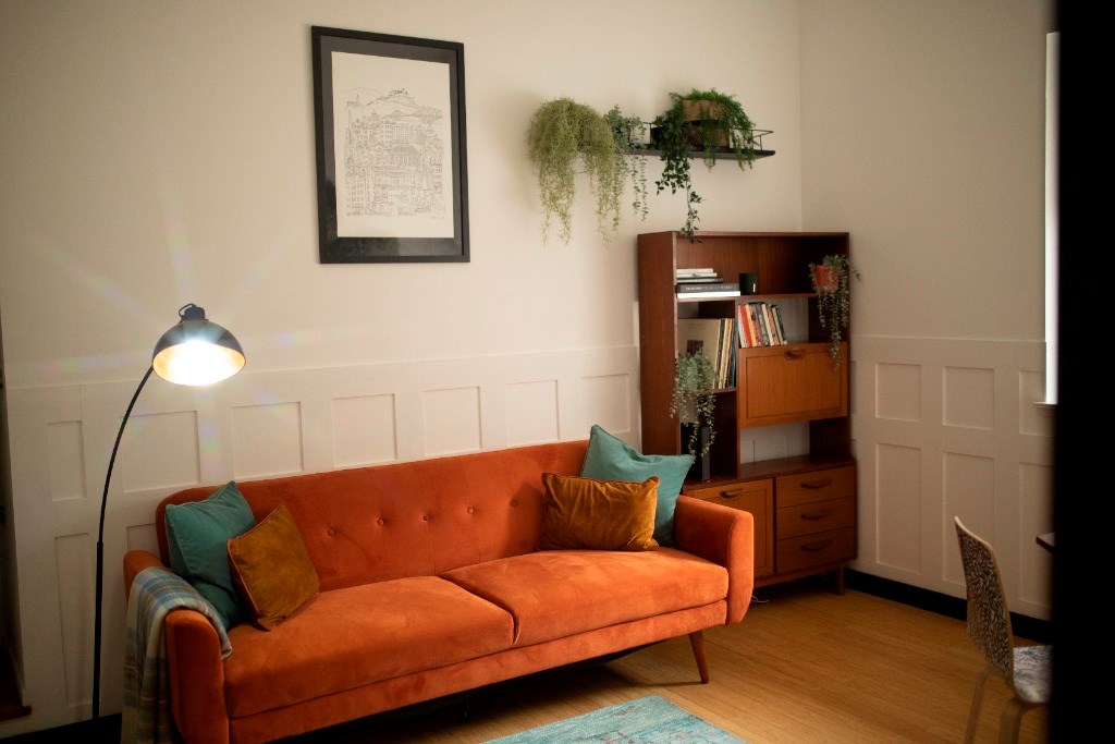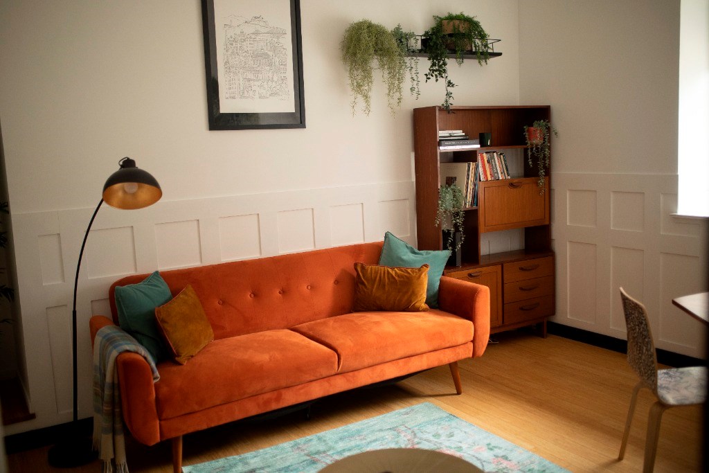 The highlight of the apartment is the modern kitchen, which comes fully equipped with a coffee machine and all the necessary appliances to cook up a storm. The kitchen opens up to a large living room furnished with mid-century furniture, which offers a cozy and comfortable living space. The living room boasts super high ceilings and bright large windows that face out onto the porch to the private secluded garden at the rear of the development.