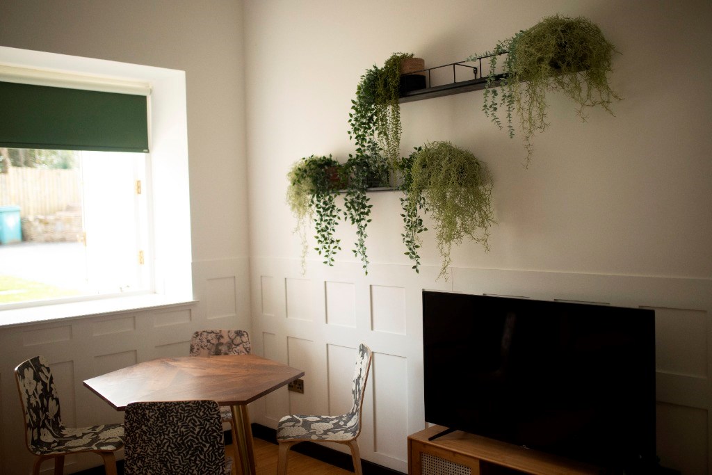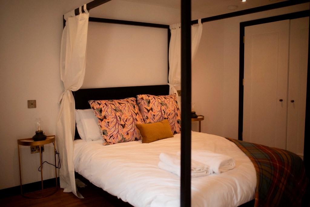 Upstairs is the grand bedroom, complete with a luxurious four-poster bed and an ensuite bathroom. The bedroom is designed to provide comfort and relaxation, with ample space to store your belongings. The ensuite bathroom features modern fixtures and fittings that add to the elegance of the room.