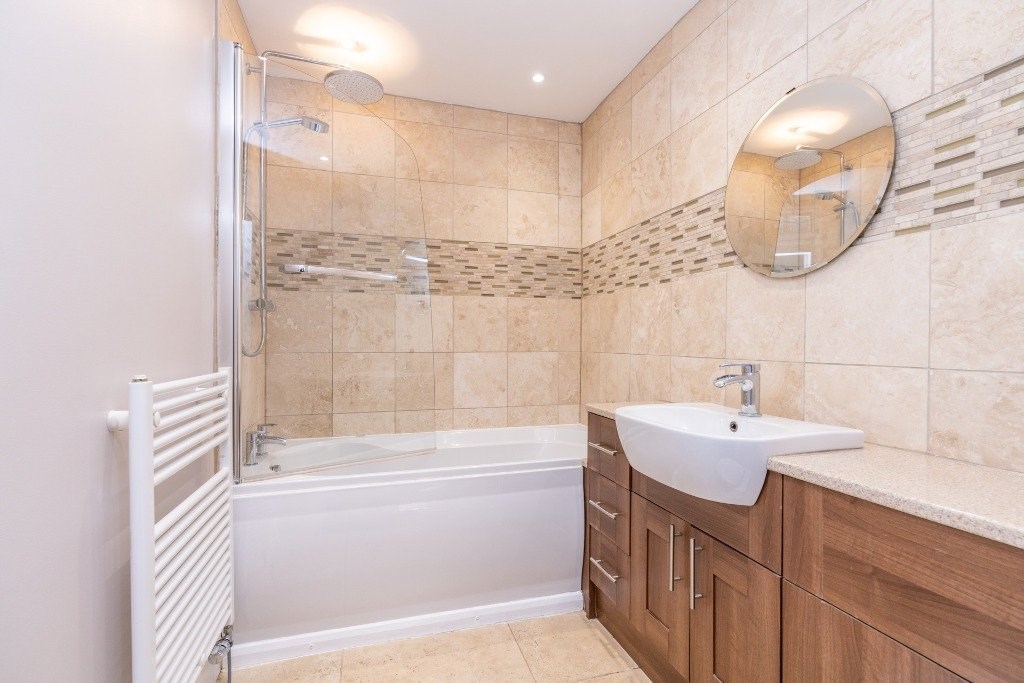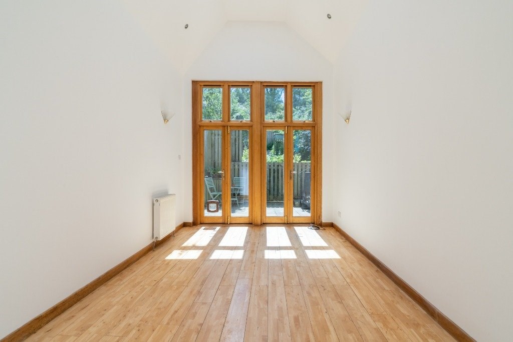 The accommodation includes an entrance hallway with feature stained glass entrance door and there are two cupboards. The lounge enjoys a quiet position to the rear of the property with double French style doors leading out to the rear garden. With vaulted ceilings, wood floor and a skylight window this bright room is on semi open plan with the kitchen which in turn features glass block windows. The kitchen is fitted with modern base and wall units with oven, hob, hood, dishwasher and fridge/freezer. There are two good sized double bedrooms, both with storage and completing the accommodation is the bathroom with three piece white suite with shower over the bath.