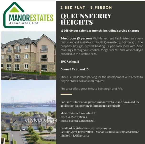 Manor Estates have two available Mid-Market properties in the Friars Croft area of South Queensferry EH30. All of the available properties are 2 bedroom flats, suitable for a maximum of 3 people with a monthly rent of £965.00 and a deposit of £965.00 payable in advance. They come with all carpets/floor coverings, washer/dryer, oven/hob/hood. Please note no fridge freezer is provided.