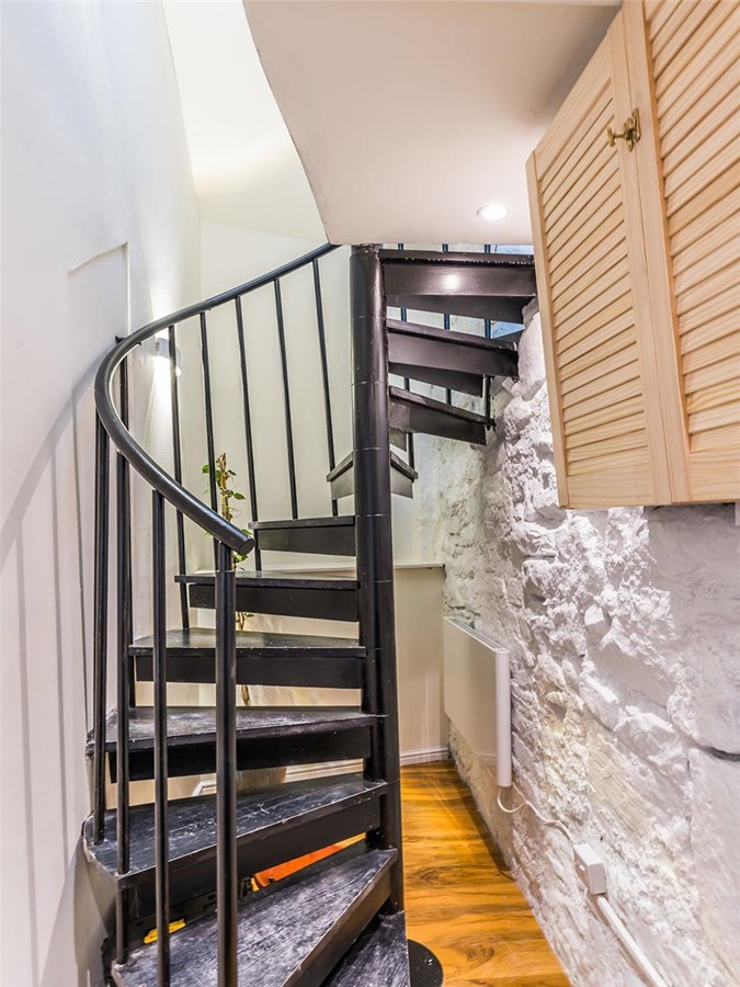 ~Entrance vestibule with spiral staircase leading to upper hallway