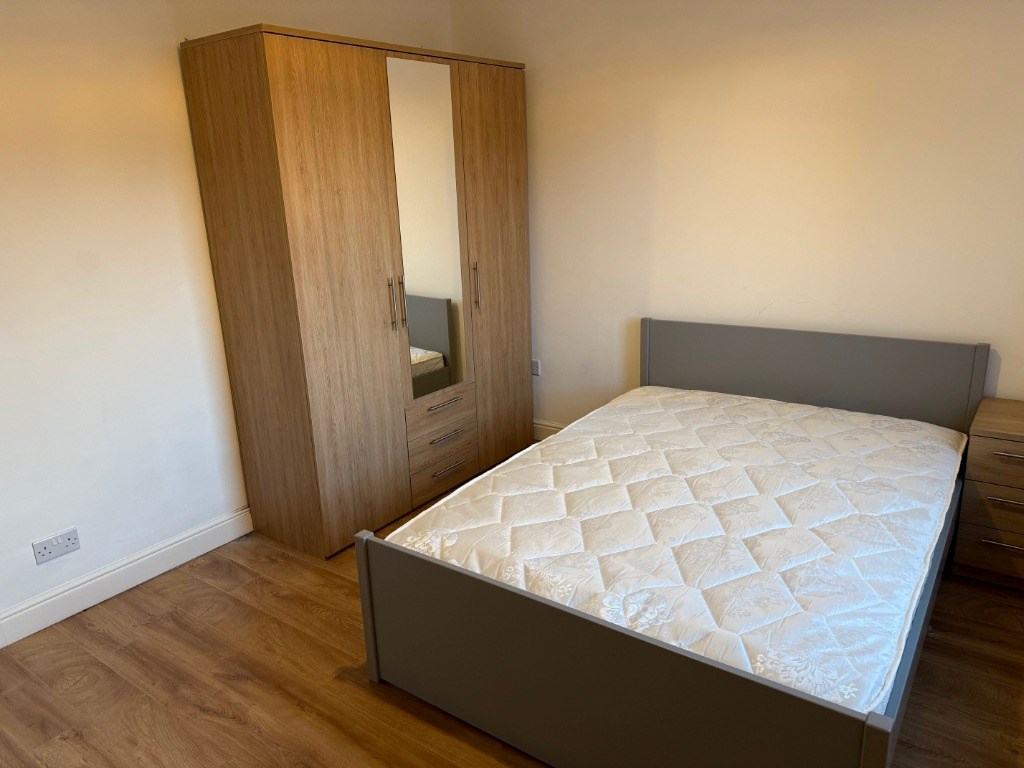 Property has - sofa, double bed, bedisde unit and wardrobe with drawers- second room is unfurnished