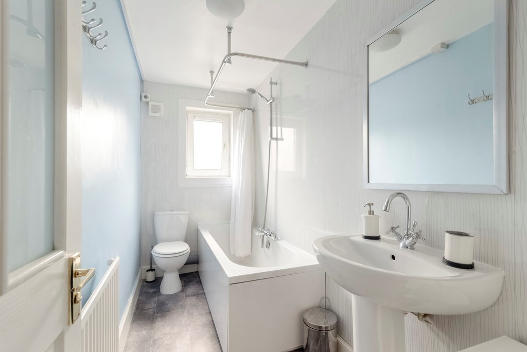 BATHROOM – Family bathroom consisting of three-piece white suite with shower over bathtub, toilet, and sink. Laminate flooring and wet walls complete this room.