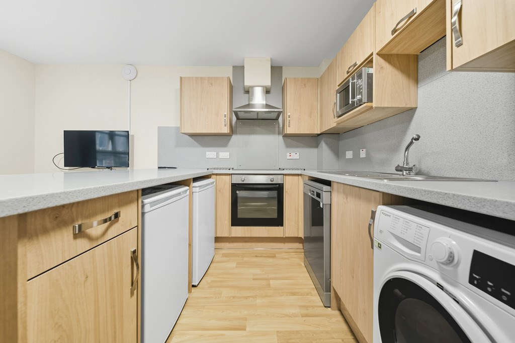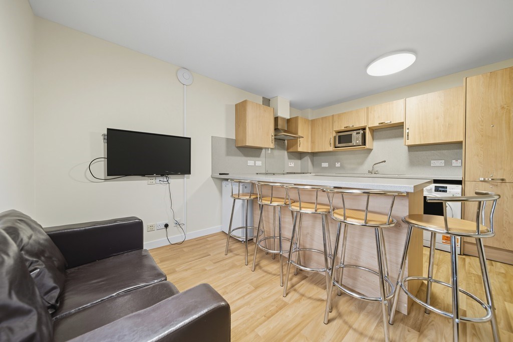 This modern ensuite room in a shared student flat offers a comfortable and convenient living space for the academic year. Each room is fully furnished and includes a private ensuite shower room, providing students with their own space and privacy. The flat also features a spacious, shared open-plan kitchen and living area, ideal for socialising and relaxing with flatmates.