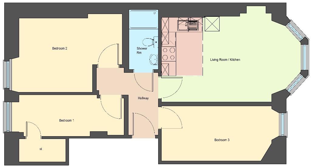 The property comprises of entrance hallway, bay windowed lounge with open plan kitchen, which includes high gloss units, appliances, and fittings, three double bedrooms, and a shower room complete with electric shower.