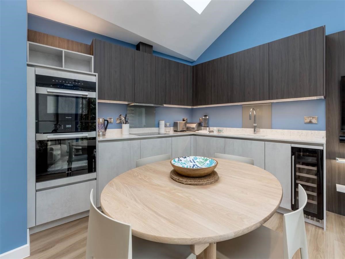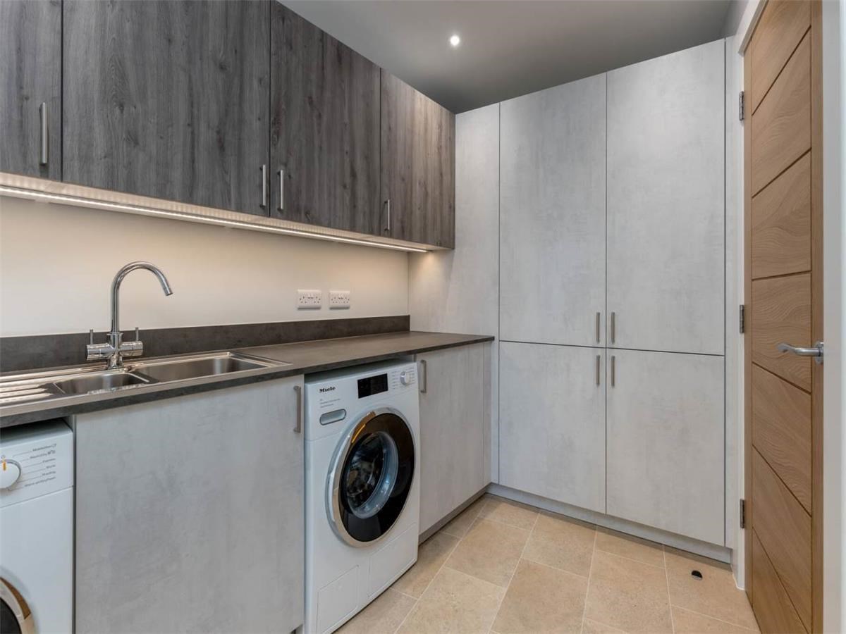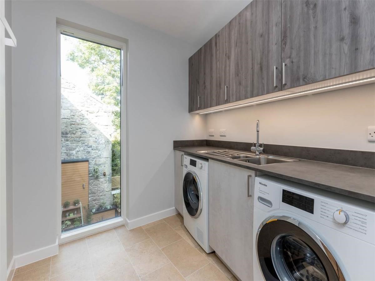 Upstairs - is the main living area, a lovely bright, open plan kitchen / dining / living room to the front of the building with ample natural light for the floor to ceiling windows and velux windows. Bedroom two and three also on this level as well as a bathroom with shower over bath tub. The utility room, with separate washing machine and tumble dryer overlook the private garden.