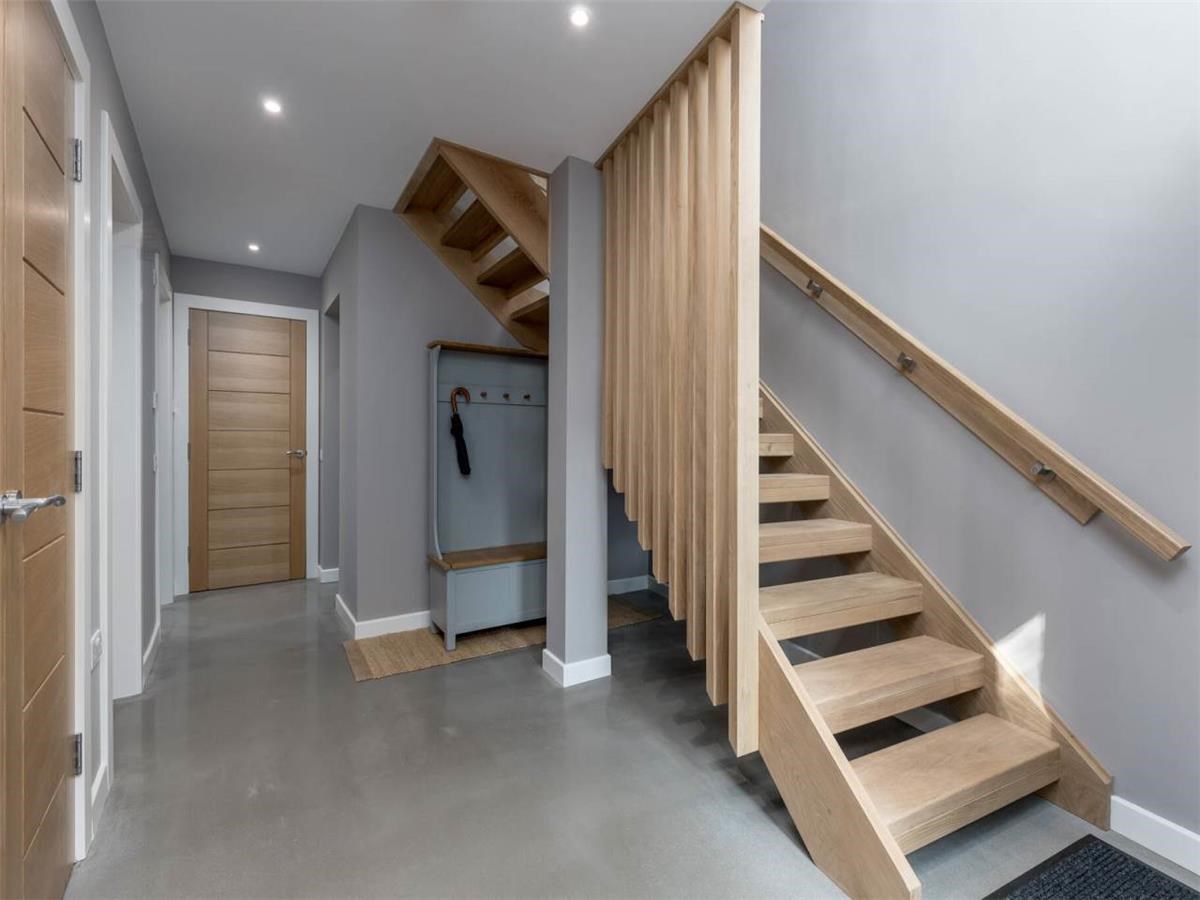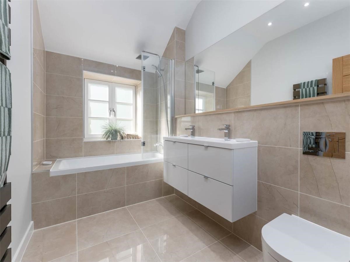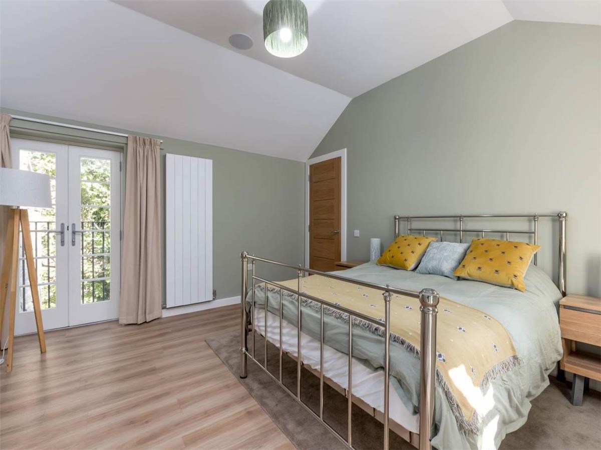 Upstairs - is the main living area, a lovely bright, open plan kitchen / dining / living room to the front of the building with ample natural light for the floor to ceiling windows and velux windows. Bedroom two and three also on this level as well as a bathroom with shower over bath tub. The utility room, with separate washing machine and tumble dryer overlook the private garden.